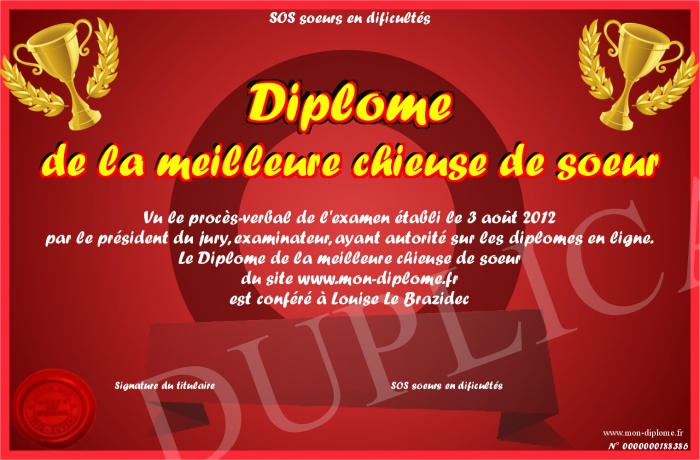 Envoyez par email votre Diplôme de la meilleure chieuse de soeur personalisé