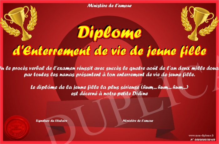 Envoyez par email votre Diplome d'Enterrement de vie de jeune fille personalisé