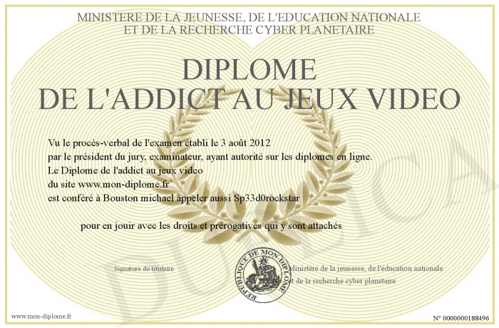 Envoyez par email votre Diplôme de l'addict au jeux video personalisé