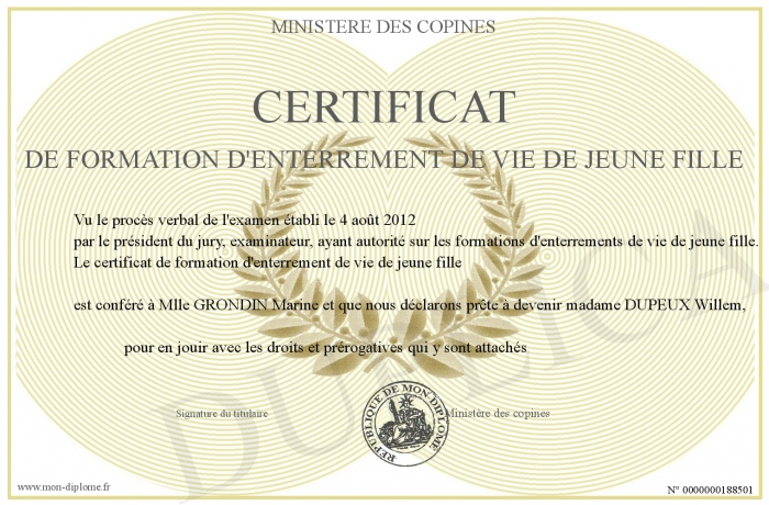 Envoyez par email votre certificat de formation d'enterrement de vie de jeune fille personalisé