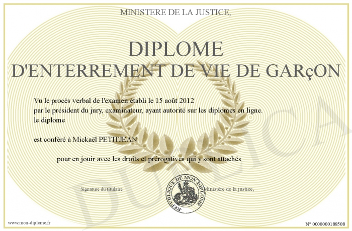 Envoyez par email votre Diplôme d'enterrement de vie de garçon personalisé