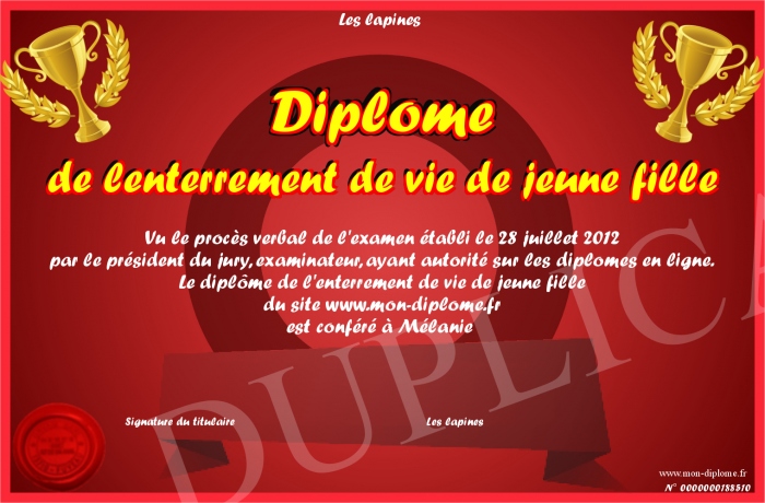 Envoyez par email votre Diplôme de lenterrement de vie de jeune fille personalisé