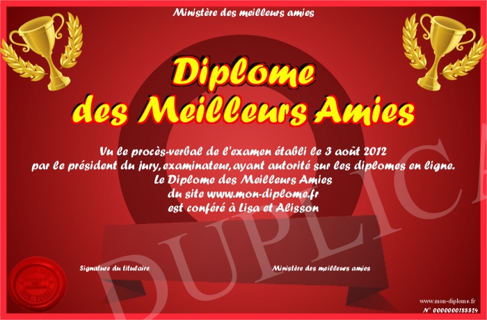 Envoyez par email votre Diplôme des Meilleurs Amies personalisé