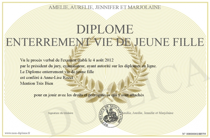 Envoyez par email votre Diplôme enterrement vie de jeune fille personalisé