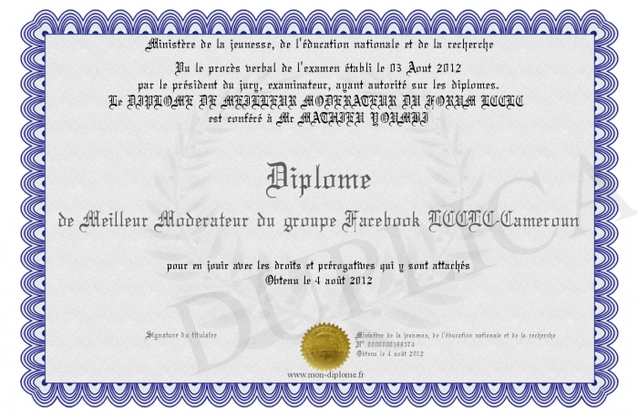 Envoyez par email votre Diplôme de Meilleur Moderateur du groupe Facebook LCCLC-Cameroun personalisé