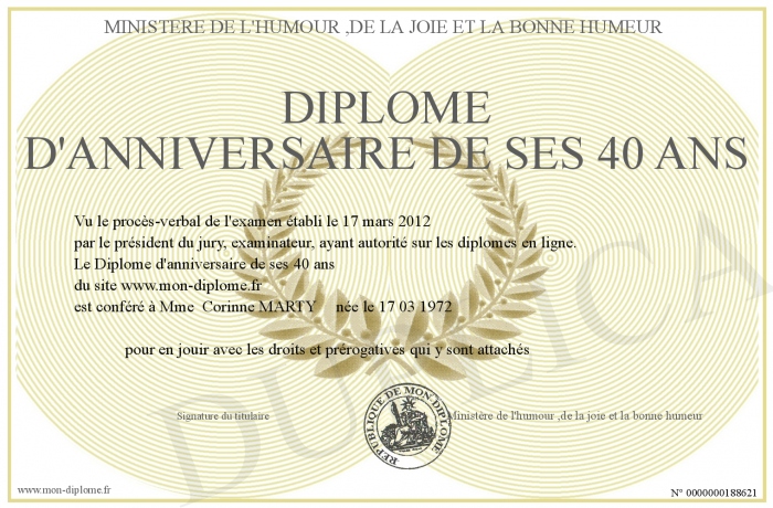 Envoyez par email votre Diplôme d'anniversaire de ses 40 ans personalisé