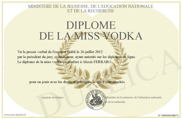 Envoyez par email votre Diplôme de la miss vodka personalisé