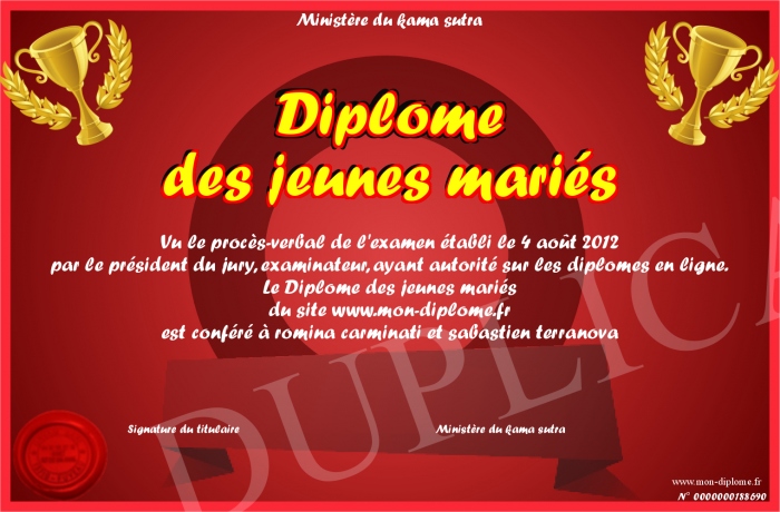 Envoyez par email votre Diplôme des jeunes mariés personalisé