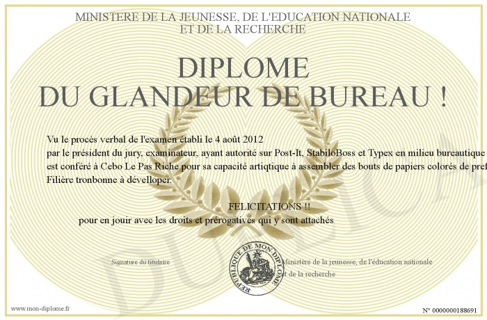 Envoyez par email votre Diplôme du Glandeur de bureau ! personalisé