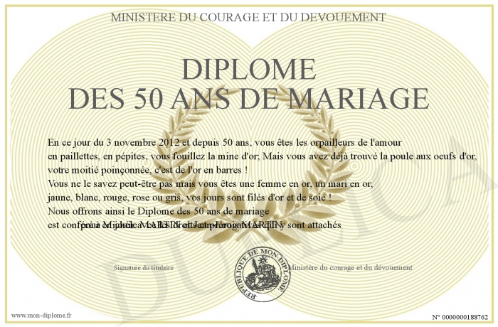 Envoyez par email votre Diplôme des 50 ans de mariage personalisé