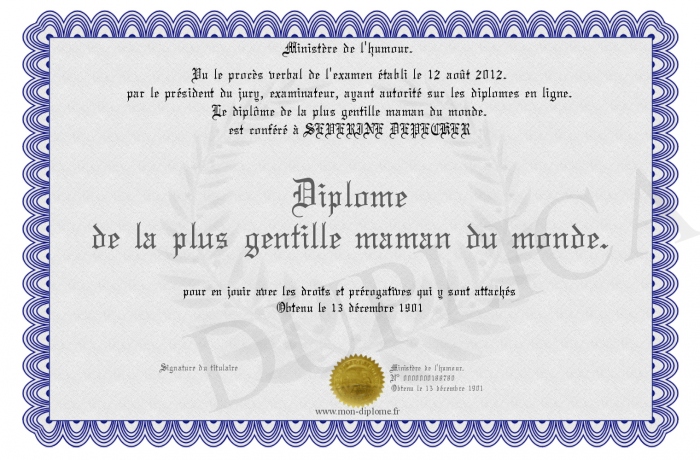 Envoyez par email votre Diplôme de la plus gentille maman du monde. personalisé