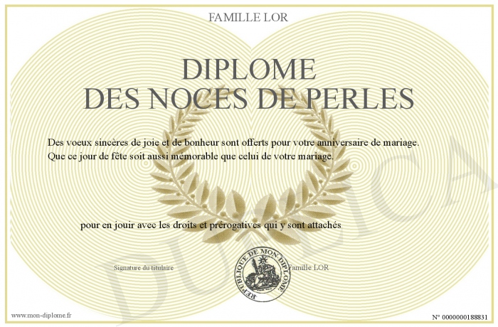 Envoyez par email votre Diplôme des Noces de Perles personalisé