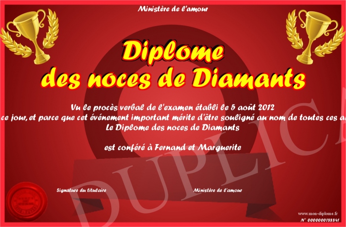 Envoyez par email votre Diplôme des noces de Diamants personalisé