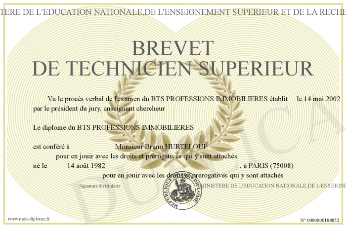 Envoyez par email votre BREVET DE TECHNICIEN SUPERIEUR personalisé