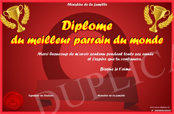 Envoyez par email votre Diplôme du meilleur parrain du monde personalisé