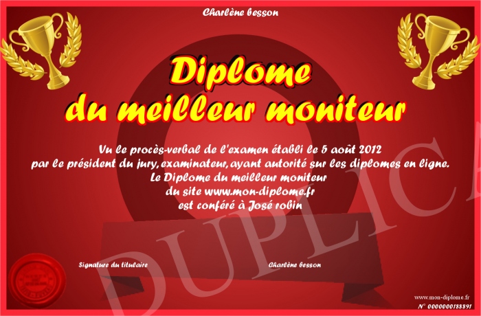 Envoyez par email votre Diplôme du meilleur moniteur personalisé