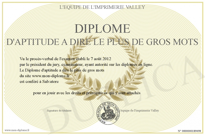 Envoyez par email votre Diplôme d'aptitude a dire le plus de gros mots personalisé