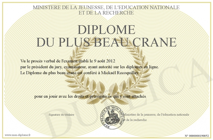 Envoyez par email votre Diplôme du plus beau crane personalisé