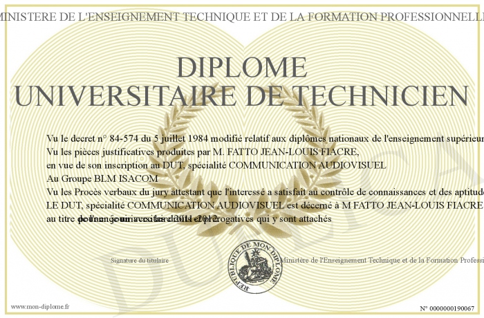 Envoyez par email votre DIPLOME UNIVERSITAIRE DE TECHNICIEN personalisé