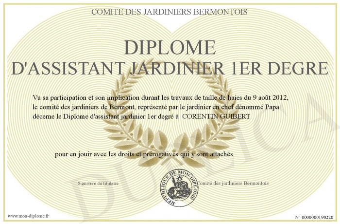 Envoyez par email votre Diplôme d'assistant jardinier 1er degré personalisé