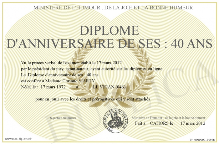 Envoyez par email votre Diplôme d'anniversaire de ses : 40 ans personalisé