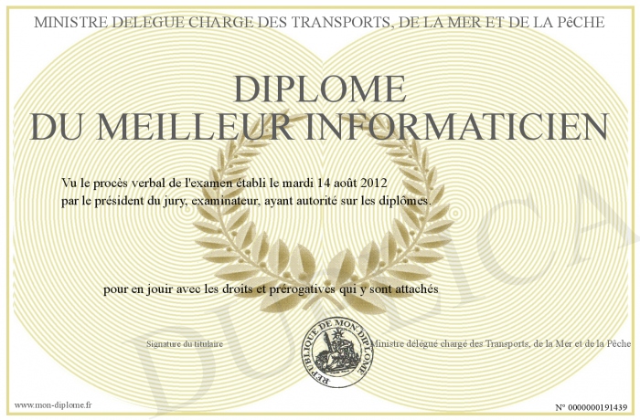 Envoyez par email votre Diplôme du meilleur informaticien personalisé