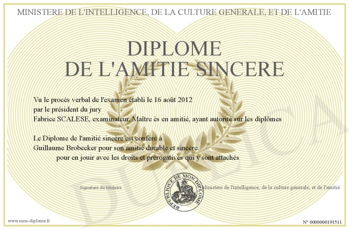 Envoyez par email votre Diplôme de l'amitié sincère personalisé