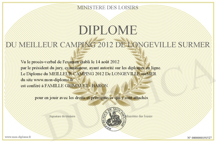 Envoyez par email votre Diplôme du MEILLEUR CAMPING 2012 De LONGEVILLE surMER personalisé