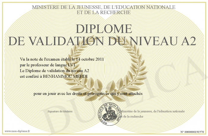Envoyez par email votre Diplôme de validation du niveau A2 personalisé