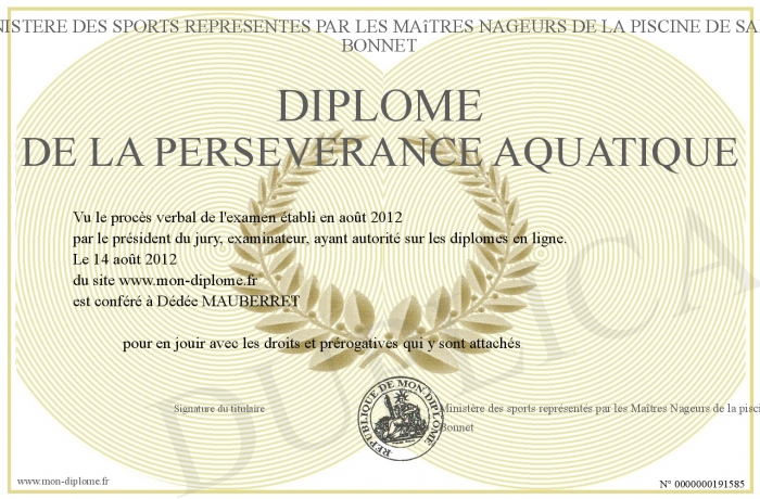 Envoyez par email votre Diplôme de la persévérance aquatique personalisé