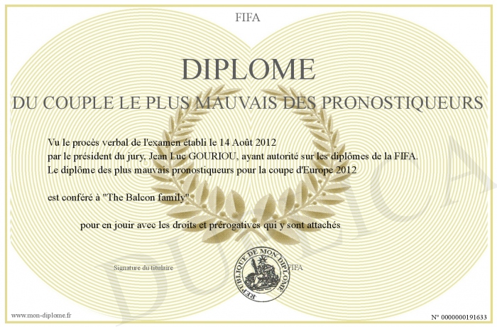 Envoyez par email votre Diplôme du couple le plus mauvais des pronostiqueurs personalisé