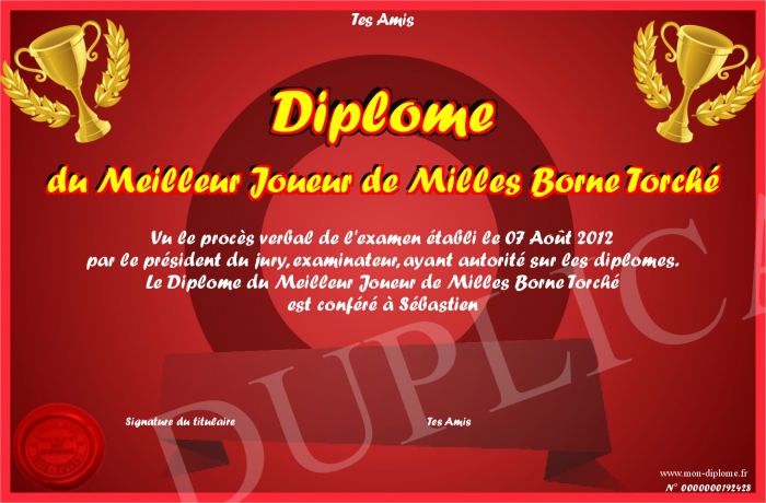 Envoyez par email votre Diplôme du Meilleur Joueur de Milles Borne Torché personalisé