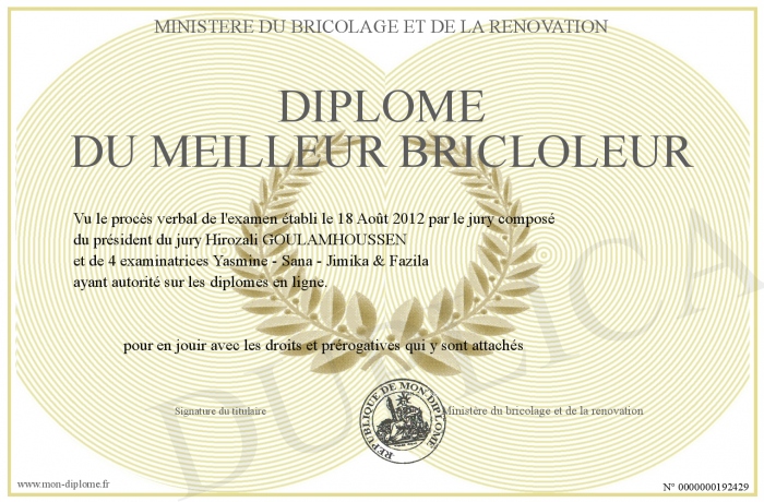 Envoyez par email votre Diplôme du meilleur bricloleur personalisé