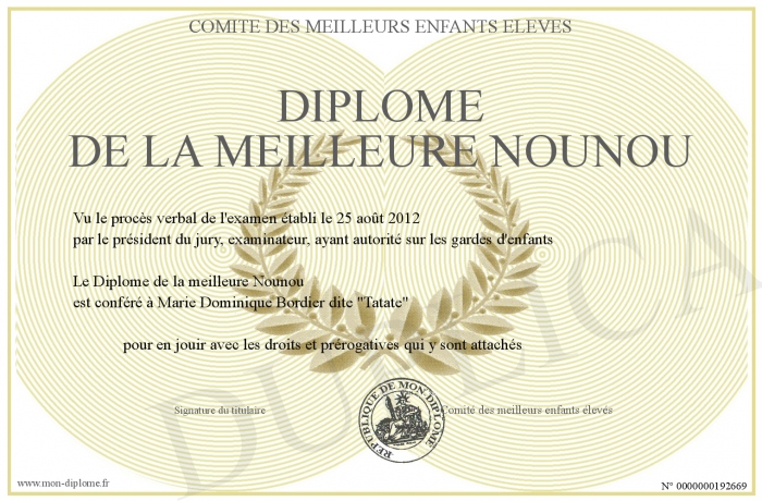 Envoyez par email votre Diplome de la meilleure Nounou personalisé