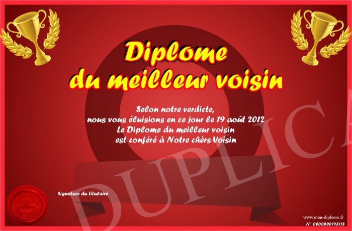 Envoyez par email votre Diplome du meilleur voisin personalisé