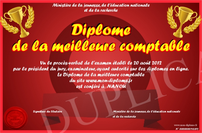 Envoyez par email votre Diplôme de la meilleure comptable personalisé