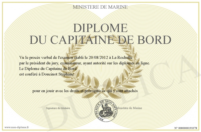 Envoyez par email votre Diplôme du Capitaine de Bord personalisé