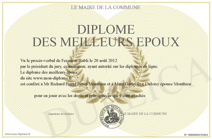 Envoyez par email votre diplôme des meilleurs époux personalisé