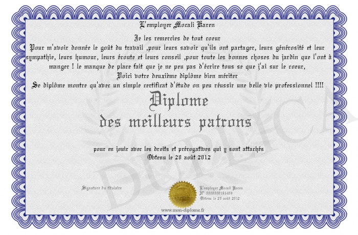 Envoyez par email votre Diplôme des meilleurs patrons personalisé