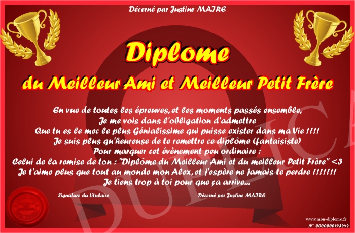 Envoyez par email votre Diplôme du Meilleur Ami et Meilleur Petit Frère personalisé