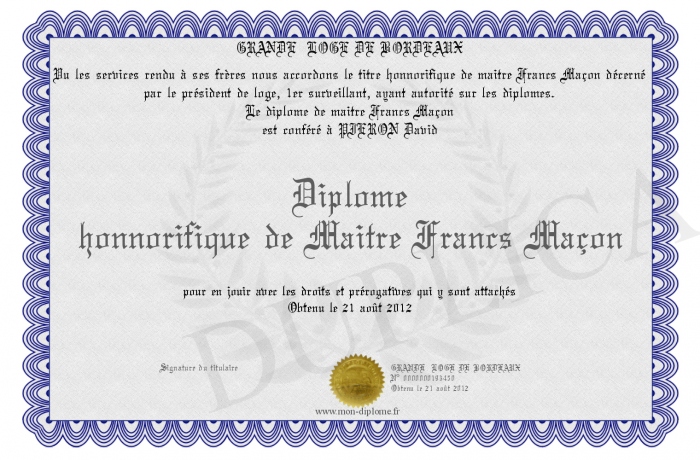 Envoyez par email votre Diplôme honnorifique de Maitre Francs Maçon personalisé