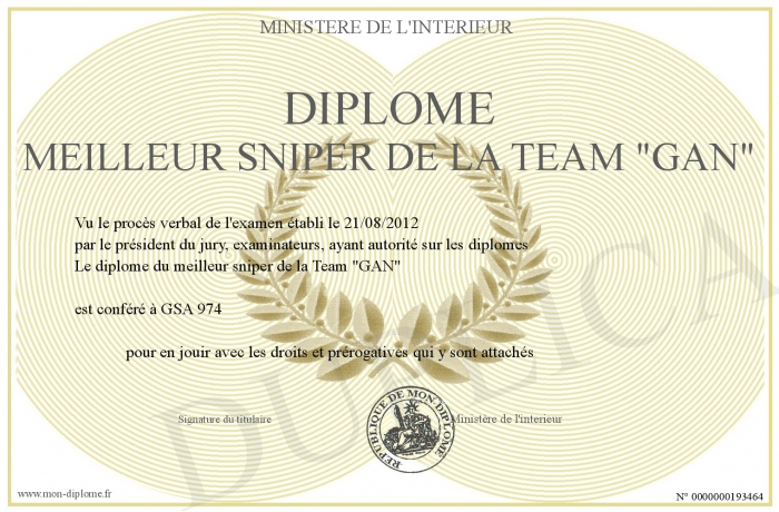 Envoyez par email votre Diplôme meilleur sniper de la Team -GAN- personalisé