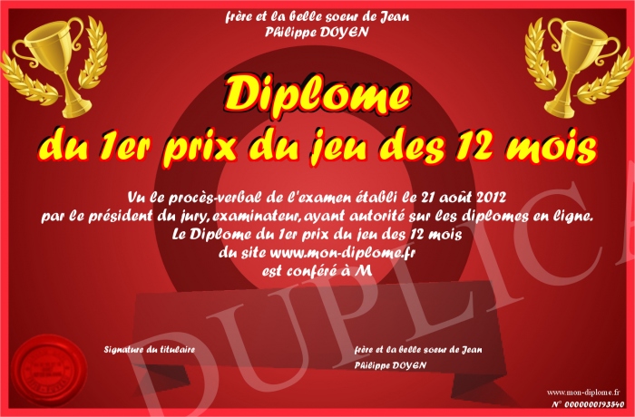 Envoyez par email votre Diplôme du 1er prix du jeu des 12 mois personalisé