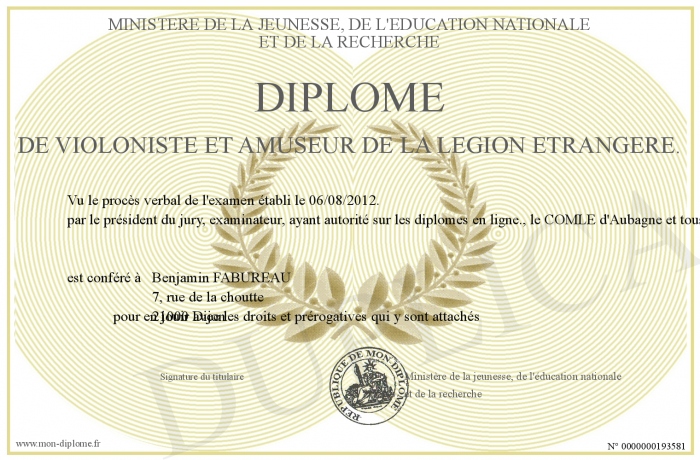 Envoyez par email votre Diplôme de violoniste et amuseur de la Légion Etrangère. personalisé