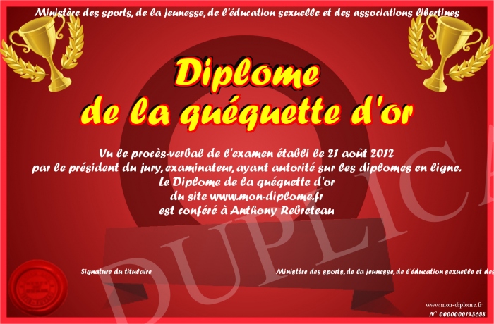 Envoyez par email votre Diplôme de la quéquette d'or personalisé