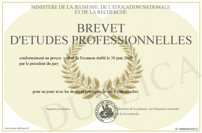 Envoyez par email votre brevet d'etudes professionnelles personalisé