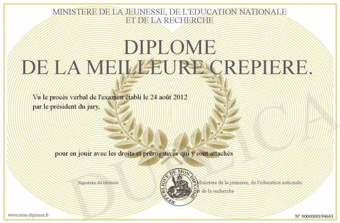 Envoyez par email votre Diplôme de la meilleure crepiere. personalisé