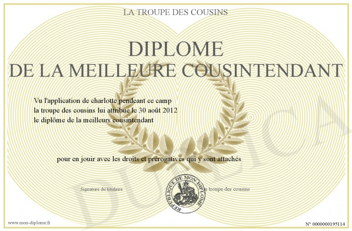 Envoyez par email votre Diplôme de la meilleure cousintendant personalisé