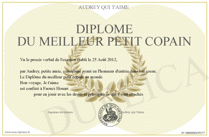 Envoyez par email votre Diplôme du Meilleur petit copain personalisé