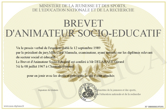 Envoyez par email votre Brevet d'Animateur Socio-Educatif personalisé